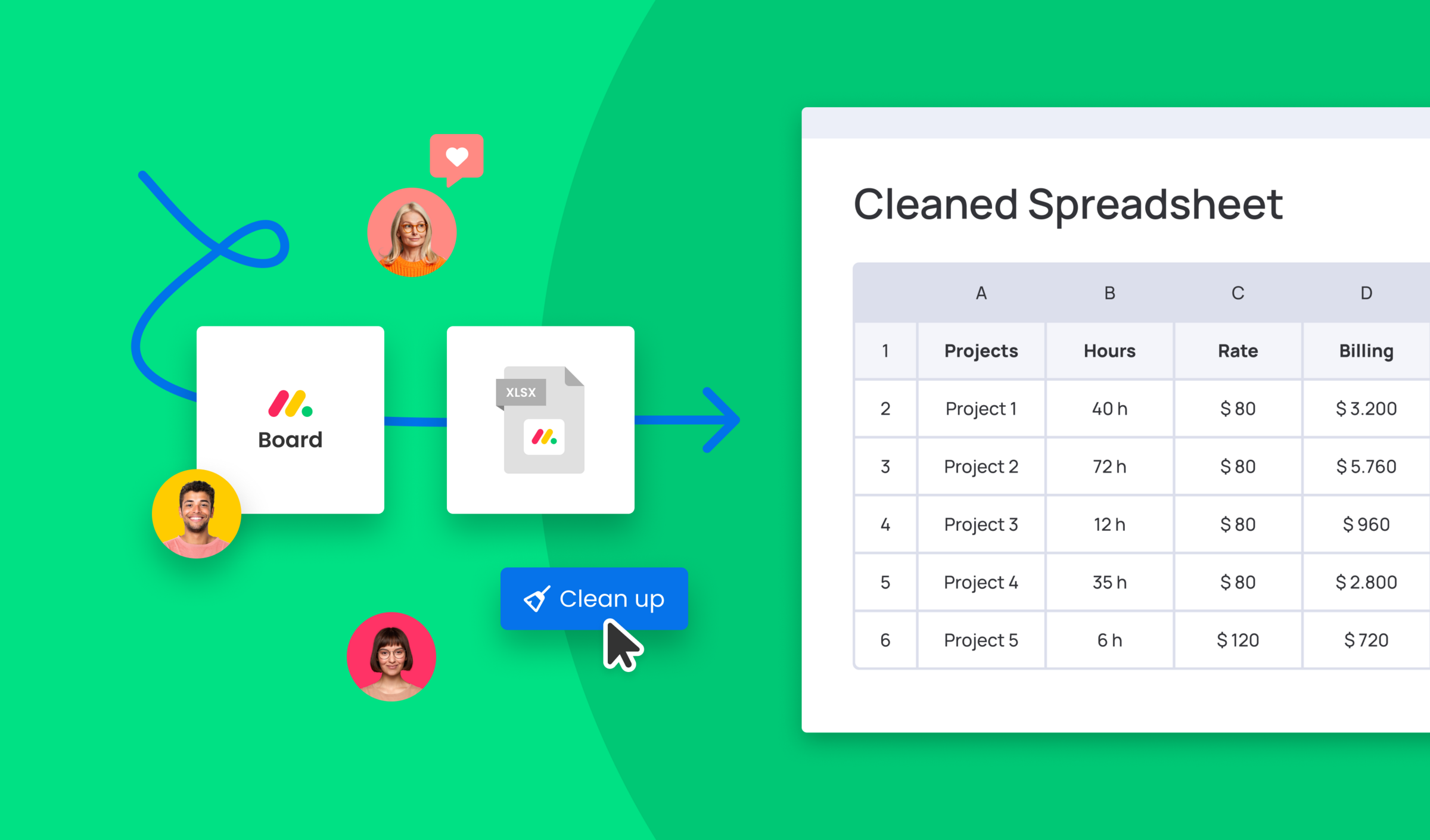 With Exported Excel Cleaner for monday.com you can stop editing your exported Excel files from monday.com manually or with macros. Easily remove the standard format, branding, and the monday.com logo. Drop any of your exported Excel files into the Exported Excel Cleaner and turn them into clean, usable, and plain Excel spreadsheets, CSV, ODS, or HTML files in no time.