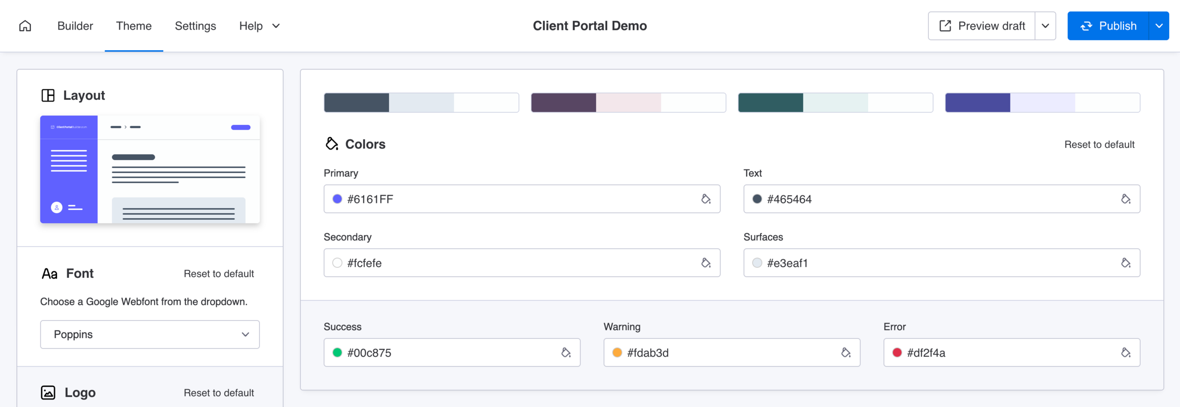 Get an idea on how your client portal will look like, but more importantly how your selected colors match to each other. You can always click Preview draft in the app header to check your current working draft in a live preview window.