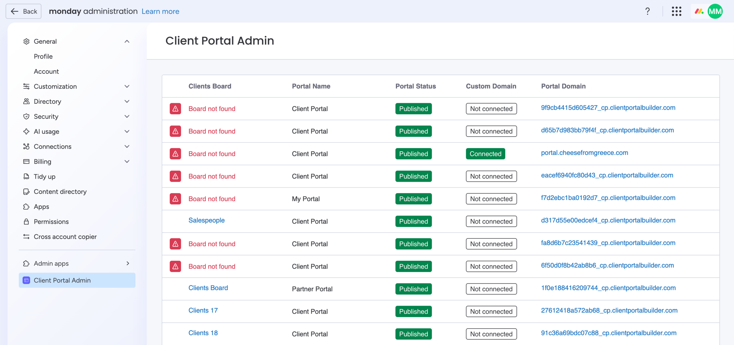 The Client Portal Admin view is restricted to monday.com account admins and used to get a bird's-eye view of all portals created across the account with Client Portal Builder. This view helps to identify outdated test portals or such portals where the Clients Board was deleted without unpublishing it before or disconnecting a Custom domain.