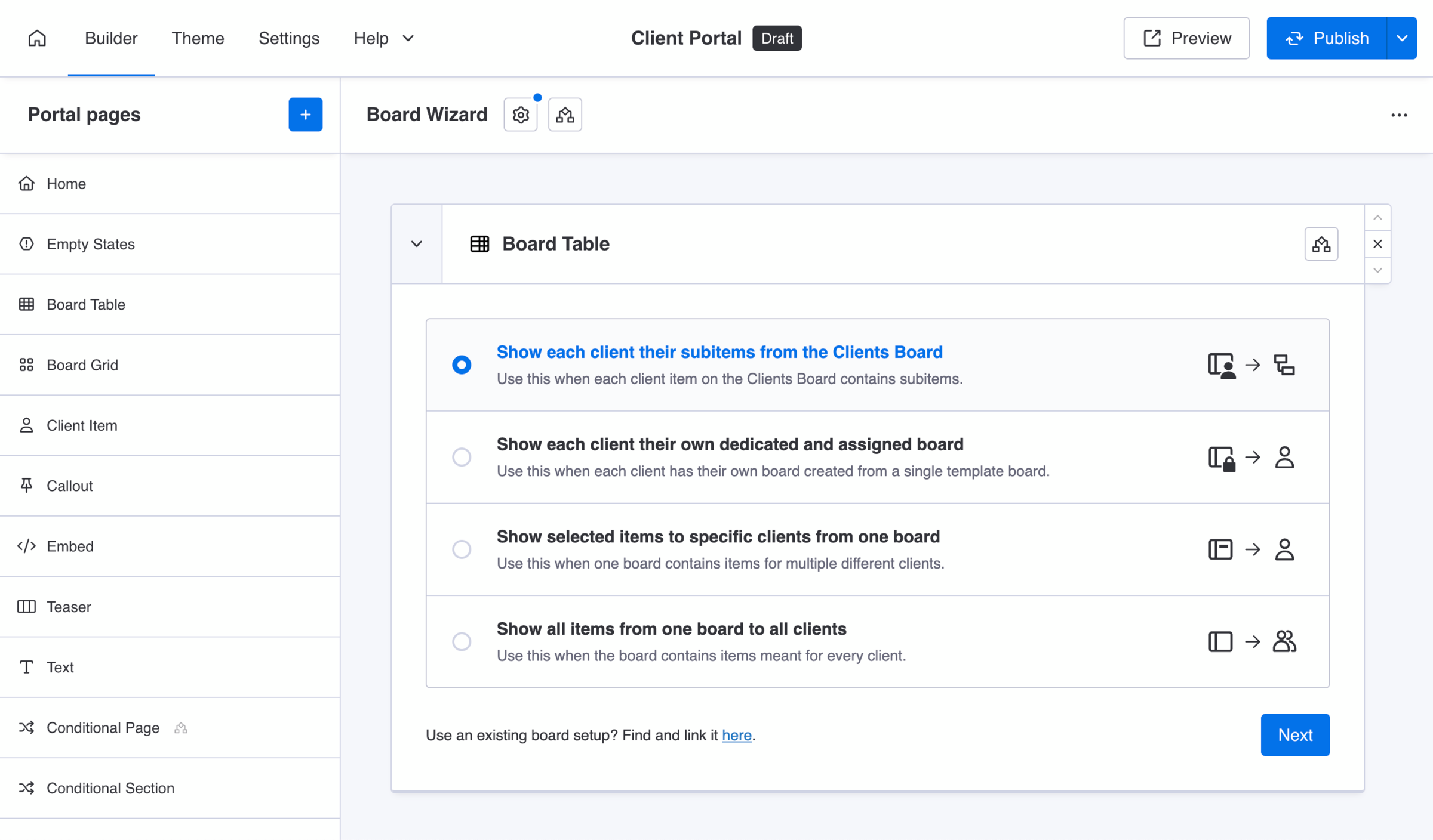 Use this when one board contains items for multiple different clients. Clients see only their own items in the client portal. Each client will see only the items from this board that belong to them.