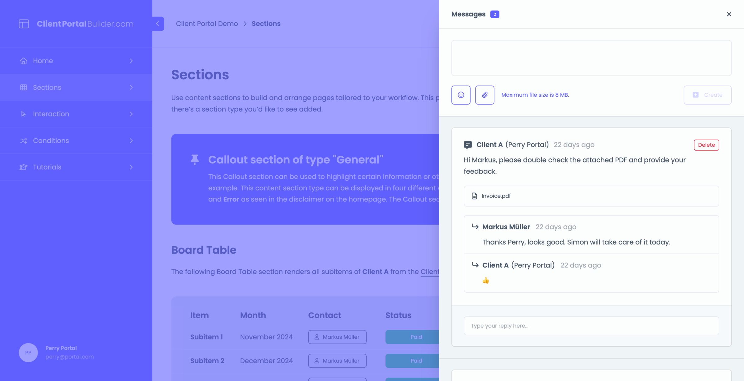 Clients can chat and exchange files with your team across the client portal. Messages and files are always tied to the related client item on the Clients Board, keeping conversations private and easy to follow for both clients and portal managers.