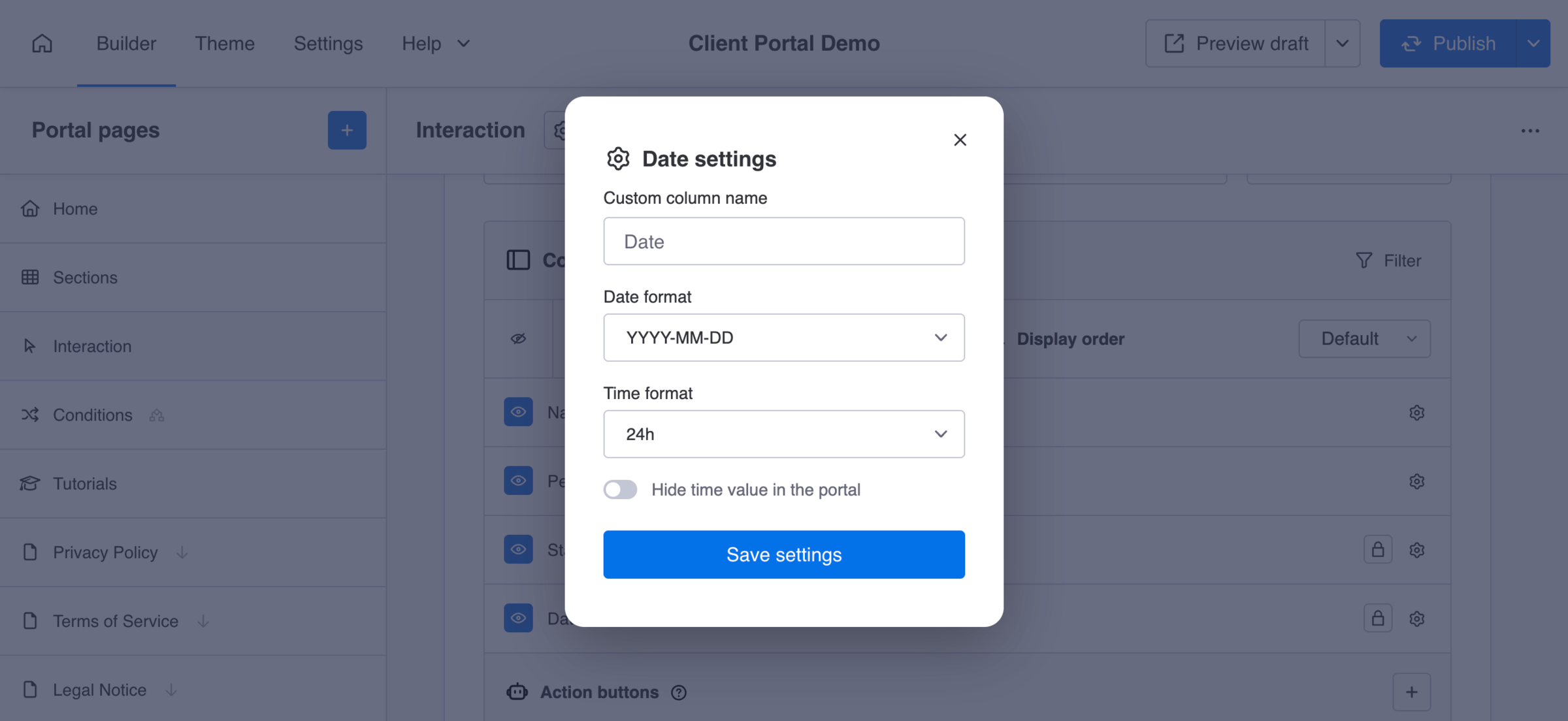 Depending on the column type and section, you can configure how data is shown to your clients, for example: