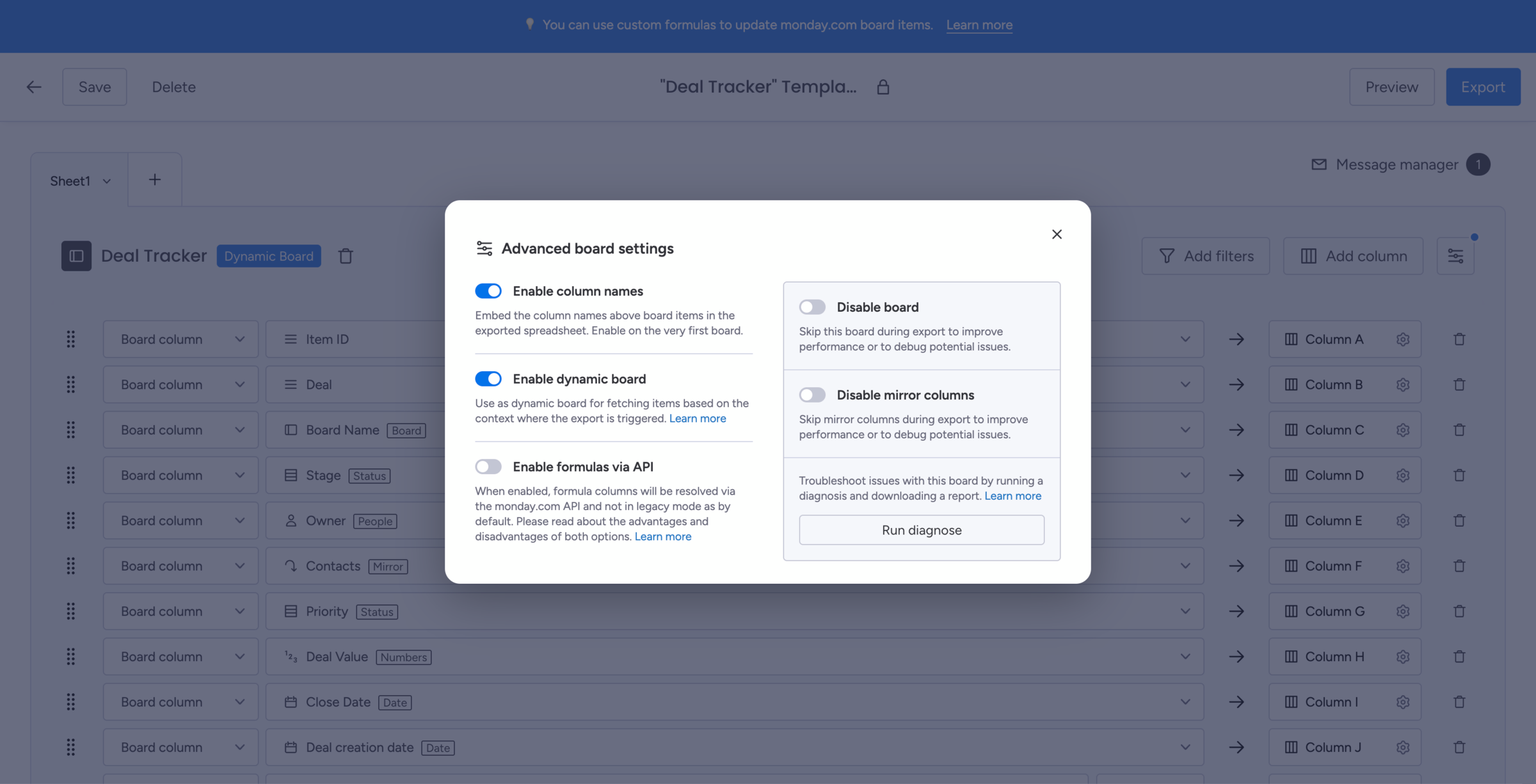 Imagine your team uses multiple monday.com boards for project management, creating a new board for each project. While these boards contain different data, they share the same structure. You need to send weekly Excel reports to each customer via email with automations. Previously, you had to create a new spreadsheet template for each board and configure it individually, such as removing specific columns, adding filters, or building custom formula columns.