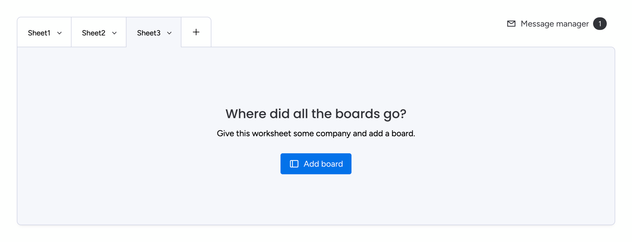 Worksheets in Spreadsheet Gorilla work like in Excel or Google Sheets. You can + add up to 6 worksheets to a spreadsheet template. Each worksheet can contain one or more boards. You want to use multiple worksheets to:
